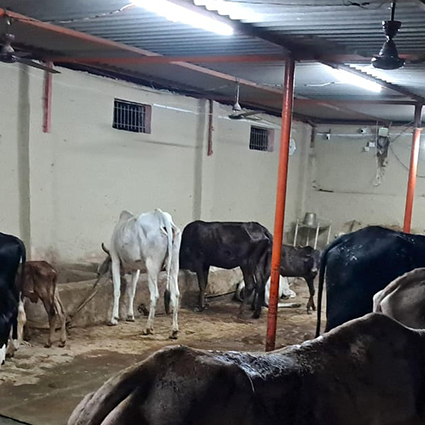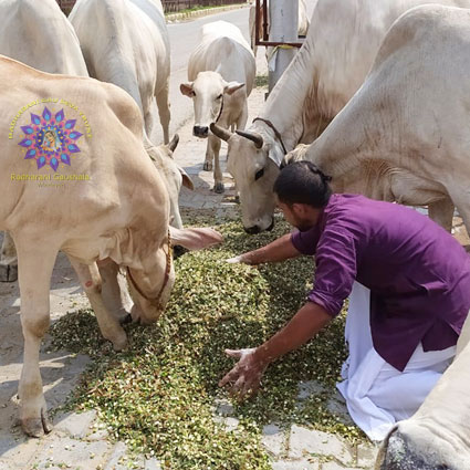 By the grace of Shri Radha Rani, we started this gaushala 4 years ago to help serve the cows of Vrindavan by providing means for their food, shelter, and medication. Our mission is to care for stray, abandoned cows, bulls, retired oxen, and orphaned calves. We provide them with hay, flour, fresh grass, clean water, medical attention, and a place where they can recuperate from injuries and stay peacefully.